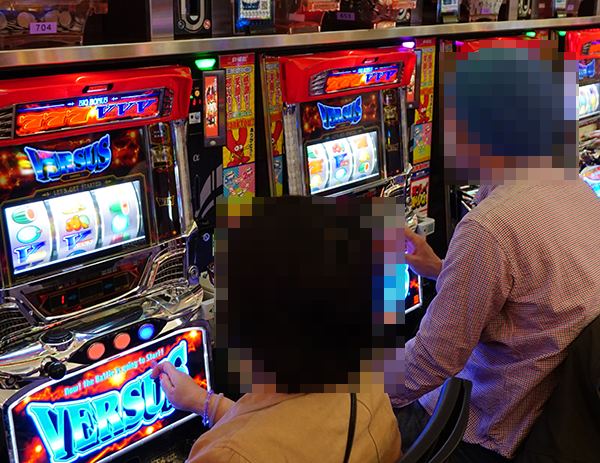 パチスロコーナーを進んでいくと、設置されている4台が満席であった「バーサス」に目が止まった。ほとんどのプレイヤーが華麗なパフォーマンスを披露していたからだ。