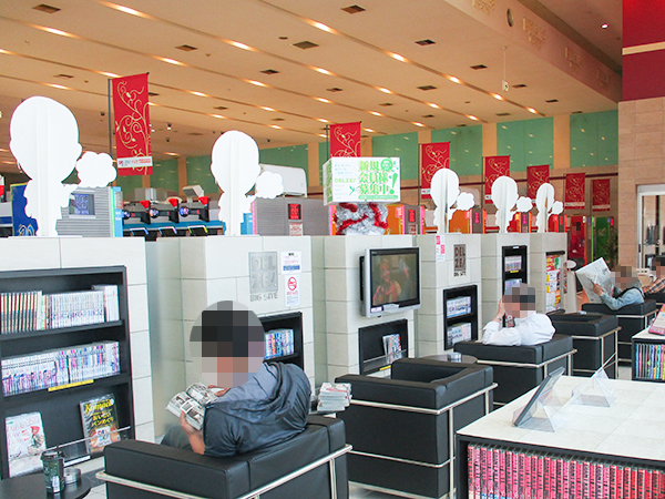 レストスペースには幅広いジャンルの漫画本が用意されており、取材時も満喫するプレイヤーが多かった。
