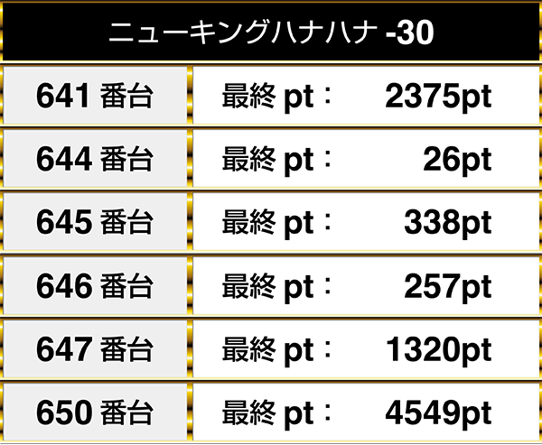 『ニューキングハナハナ-30』にも4000ptを上回るデータがあり、機種全体では10台中6台がプラスptとなっていた。