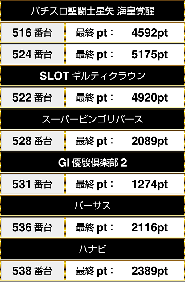 『パチスロ聖闘士星矢 海皇覚醒』と『SLOTギルティクラウン』は、あわせて3台が4000ptオーバー!