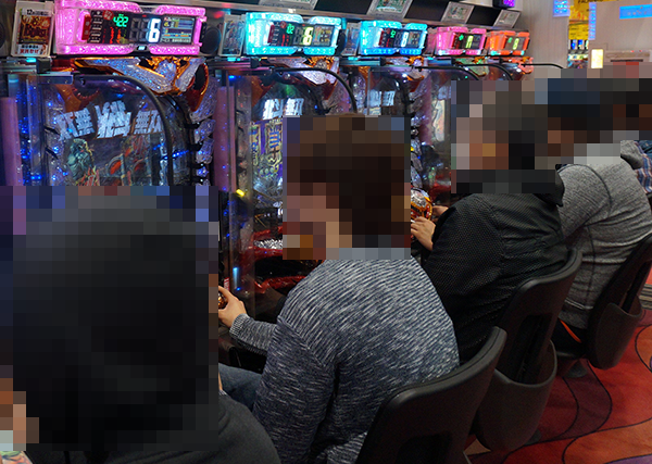 シマの一帯を眺めているあいだも、ほとんどのプレイヤーが遊技をやめずにハンドルを握り続けており、盛り上がりがおとろえることはなかった。