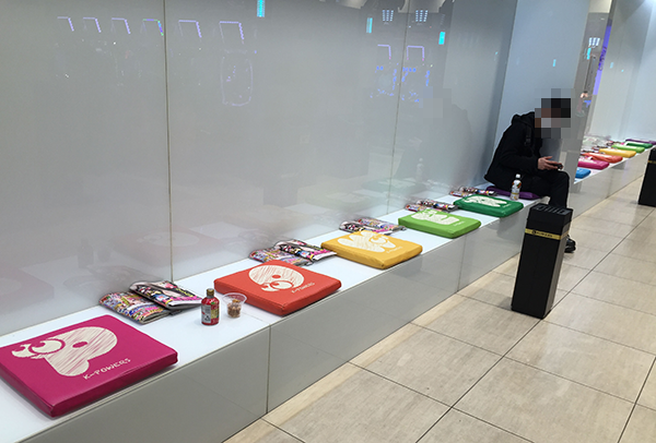カラフルな座布団が並べられている休憩コーナーには、パチスロ雑誌と週刊誌がひとつの席に一冊ずつ置かれている。こういったサービス面や接客面を好んでいるプレイヤーも多いのではないだろか。