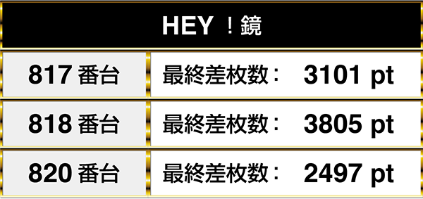 高稼働の『HEY!鏡』と『沖ドキ!』で多くのプレイヤーがポテンシャルを発揮し、大盛り上がりとなっていた。