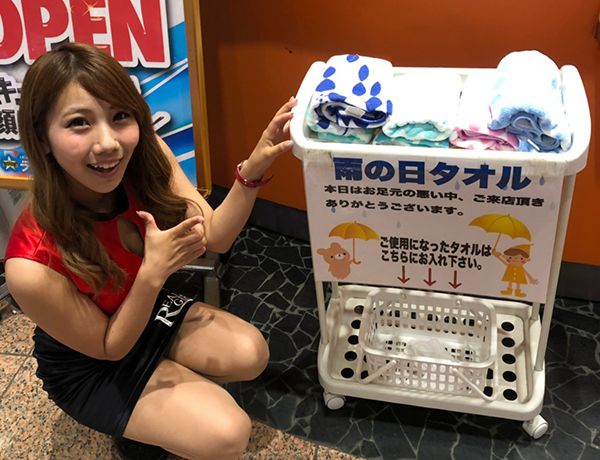「ラッキープラザ」にあるタオルの貸し出しサービスや「ドムズ岩国店」に貼られている最新機種がひと目でわかる大きなポスターなど、どちらの店舗にもステキなポイントが満載であった。