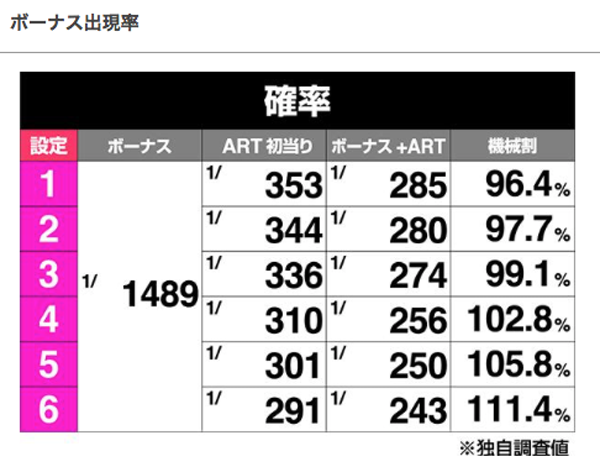 ARTに注目ポイントが多く、初当り確率は高設定ほど高い。