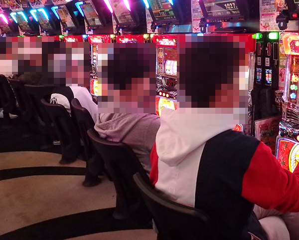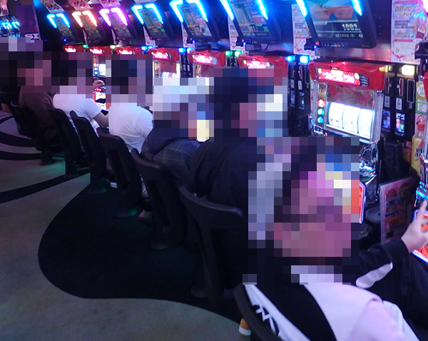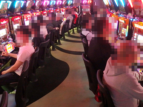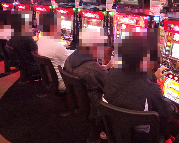 うれしそうにレバーを叩いている姿がみられるなど、機種の魅力を堪能できているような場面をあちこちで目にしている。各シマは輝くような笑顔で彩られており、ひときわ楽しげな雰囲気が感じられた。