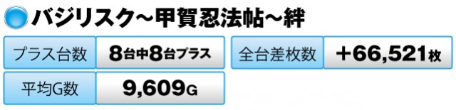 パチスロでは、現役機種の中で人気ナンバーワンの呼び声も高い『バジリスク〜甲賀忍法帖〜絆』が、驚異的なパフォーマンスを披露。