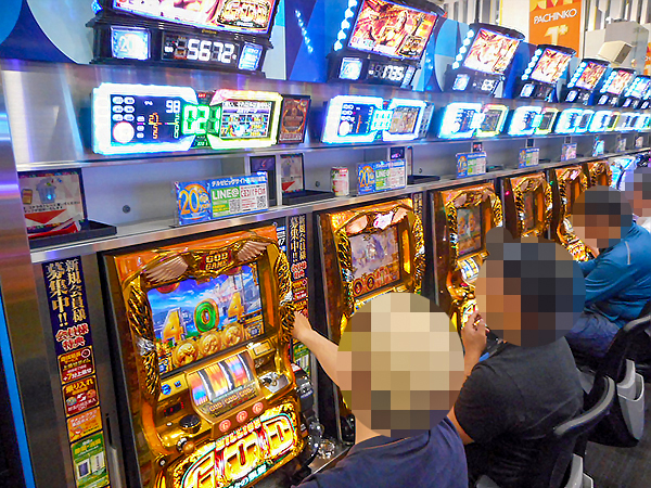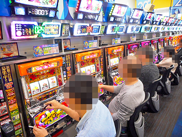 500円/89枚パチスロも高稼働。楽しそうにレバーを叩くプレイヤーの姿が多数見られ、実に華やかな光景が広がっていた。