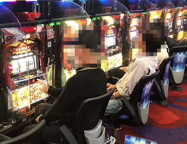 とくに楽しそうに遊技をおこなう姿があったのは「ツインドラゴンハナハナ‐30」。