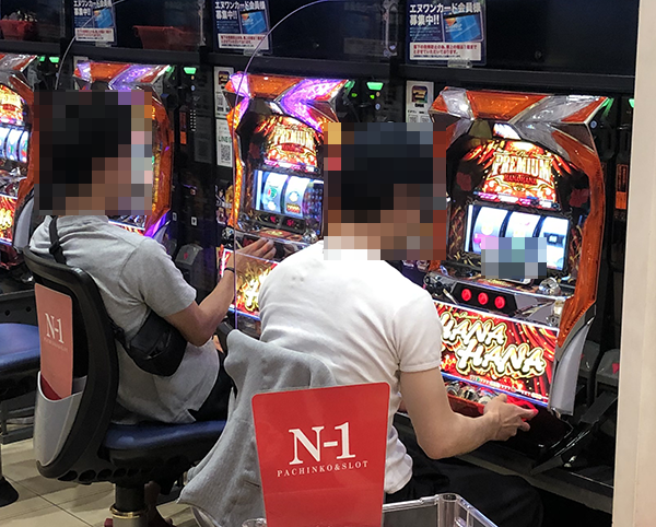 おなじシマや向かい合わせのシマには、ほかのハナハナシリーズが設置されている。機種のポテンシャルを引き出すといった光景も各所で目にしているが、もっとも充実した様子で遊技をおこなうプレイヤーがいたのは「プレミアムハナハナ‐30」だ。