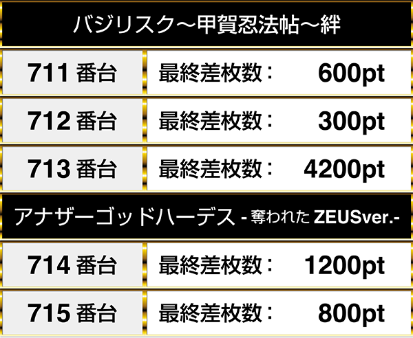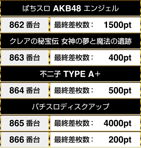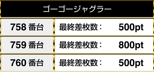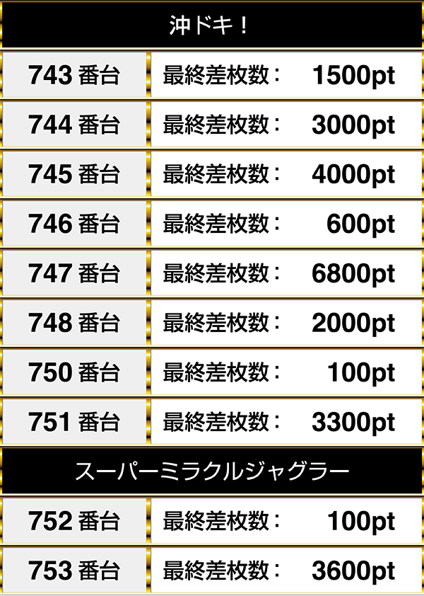 6台並びでプラスptを記録している場所があり、そのうちの3台は3000ptオーバーであった。