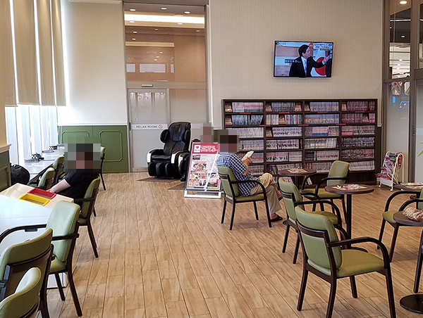 遊技台の周りをはじめ、店内はすみずみまで清掃が行き届いている。漫画本やマッサージチェアなどが用意されたレストスペースも居心地がよく、休憩中も快適に過ごせるように思えた。