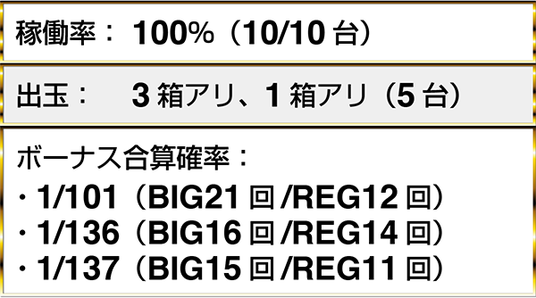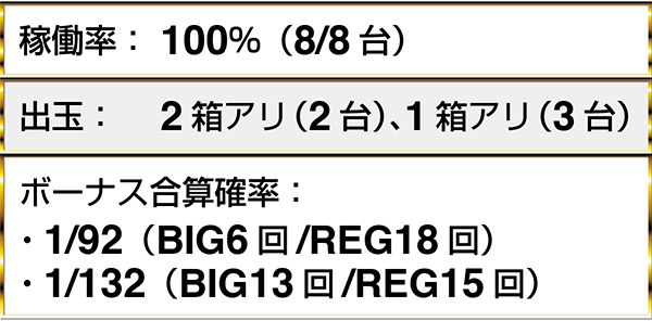 ジャグラーシリーズでは、『ゴーゴージャグラー』や『ファンキージャグラー』などでボーナス合算確率1/140を上回るデータがみられた。
