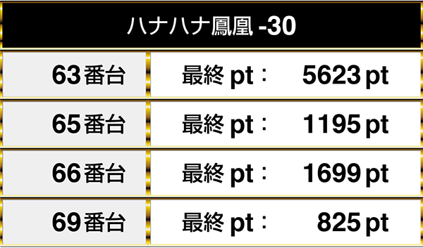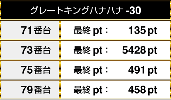 『ハナハナ鳳凰-30』と『グレートキングハナハナ-30』はどちらも10台中4台がプラスpt。そのうちの2台は5000ptを越えていた。