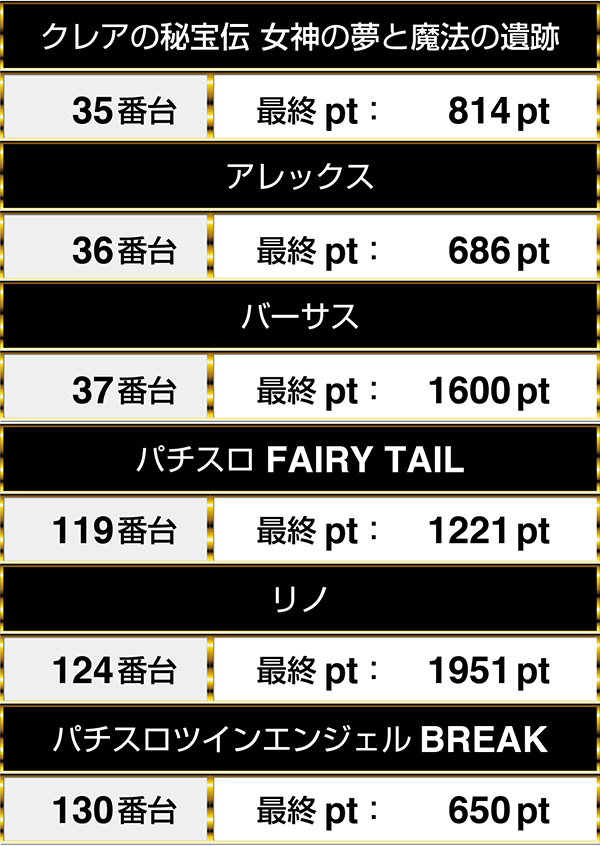 『クレアの秘宝伝 女神の夢と魔法の遺跡』と『パチスロ FAIRY TAIL』もプラスptを記録。