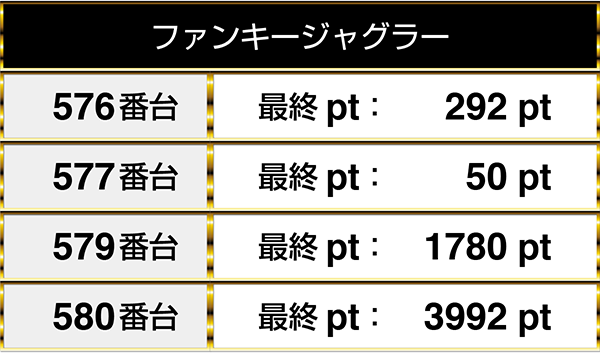 『ファンキージャグラー』の5台中4台がプラスptを記録!!