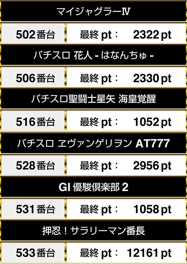 『パチスロ ヱヴァンゲリヲン AT777』や『マイジャグラーⅣ』では2000ptを上回るデータを確認した。