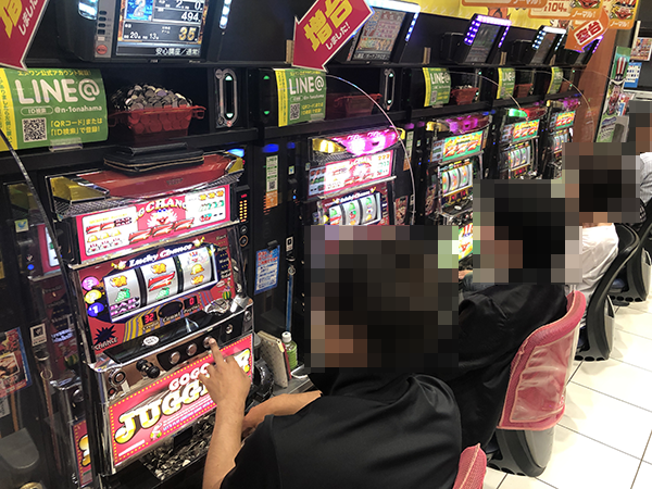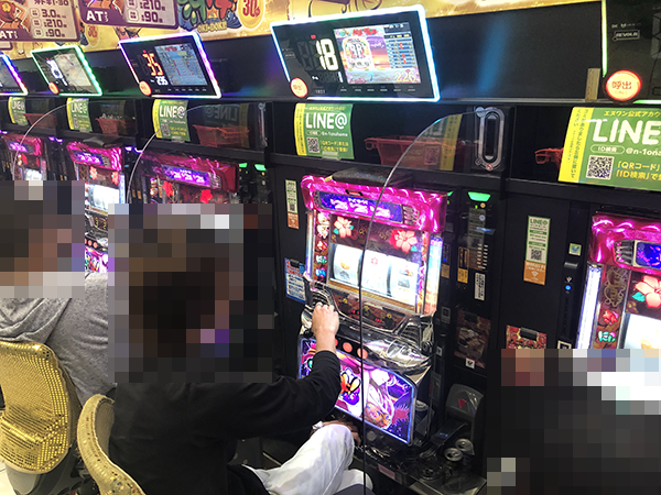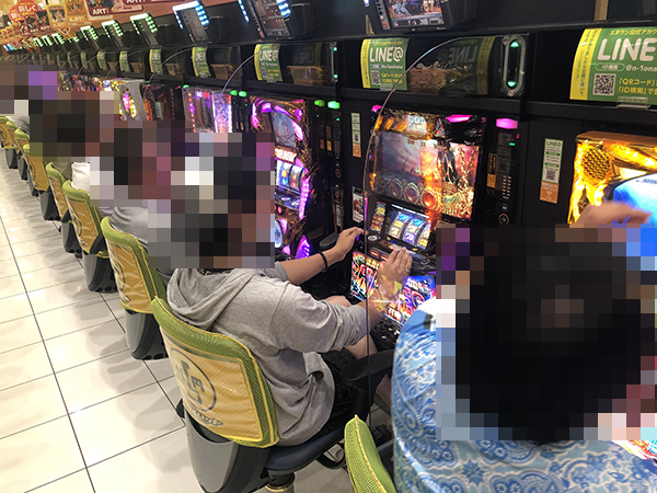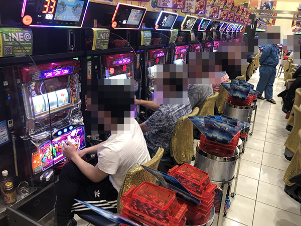 20円パチスロと5円パチスロのどちらも盛況。さまざまな機種に見応えのある光景が広がっていた。