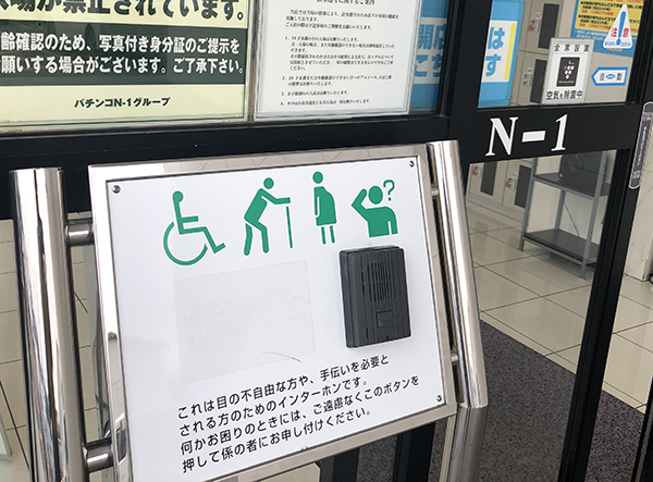 ホールの入り口には、スタッフの手伝いが必要なプレイヤーのために、インターホンが設置されている。車椅子のプレイヤーや目の不自由なプレイヤーでも、気軽に来店できそうじゃ。