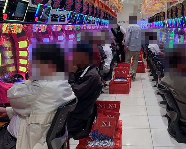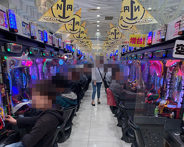 4円パチンコや1円パチンコ、1円/5玉パチンコの各シマが明るいムード。