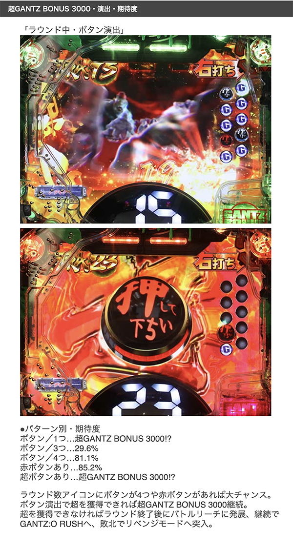どの場面でも星人を倒して100てんを獲得すれば、超GANTZ BONUS 3000に突入し、大当りと小当りRUSHをあわせて3000個(払い出し)以上の出玉の獲得が可能だ。