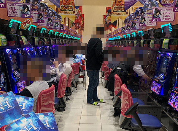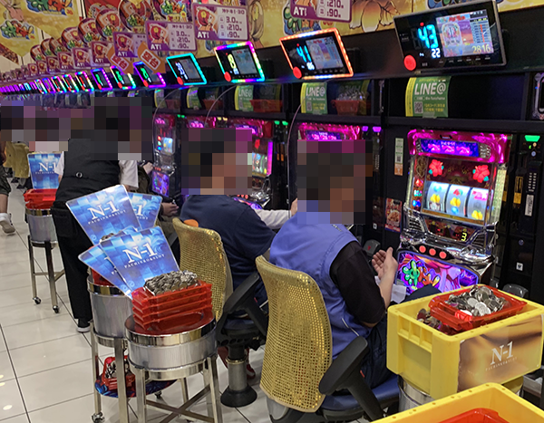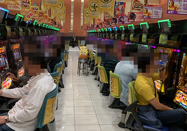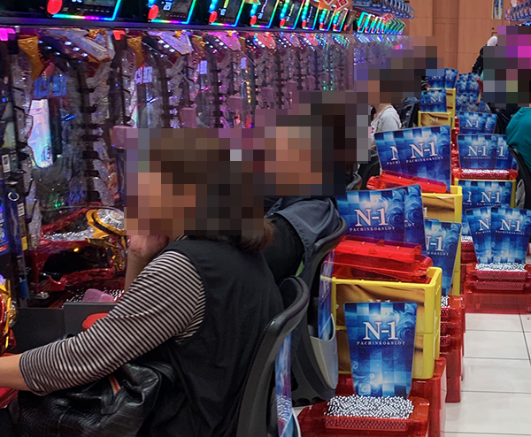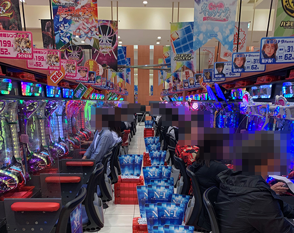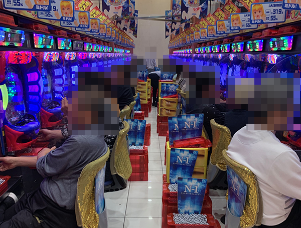 4円パチンコと1円パチンコ、1円/5玉パチンコのどのシマも楽しげなムード。
