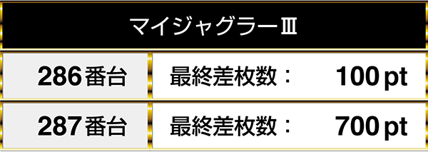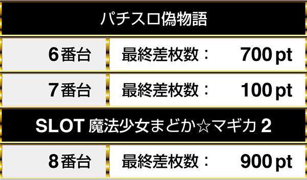 『パチスロ偽物語』では2台が連なってプラスpt。となりに設置されている『SLOT魔法少女まどか☆マギカ2』をあわせると、プラスptのデータが3台並んでいた。