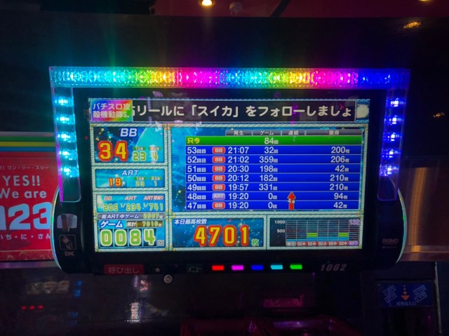 パチスロ全体では、453台中半数近くの221台がプラスで、トータルの差枚数は+215,264枚という素晴らしい結果に。