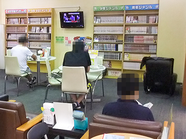 レストスペースには幅広いジャンルの漫画本が用意されており、取材時も満喫するプレイヤーが多かった。