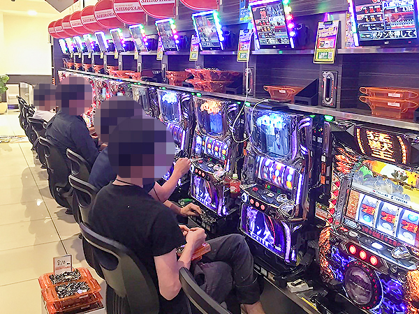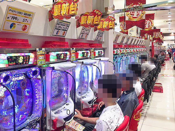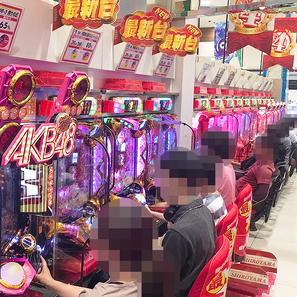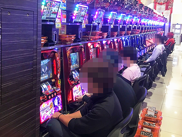 18時過ぎの4円パチンコをチェックすると「P咲-Saki-阿知賀編 役満GOLDバージョン」や「P SHOW BY ROCK!!」が大盛り上がり。プレイヤーの嬉しそうな表情が印象に残っている。