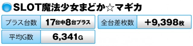 17台中8台がプラスで全台差枚数が+9,398枚と、さすがの結果を残した。