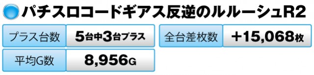 『まどマギ2』と同じく、9,000G近い平均回転数を記録した『パチスロコードギアス反逆のルルーシュR2』も上々。
