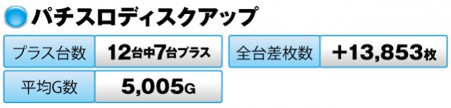 12台中7台がプラスで全台差枚数は+13,853枚を叩き出した。