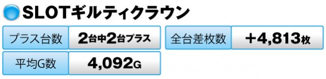 パチスロ全体では453台中174台がプラスでトータルの差枚数が+159,456枚に達しており、またしても大成功のうちに幕を閉じた。