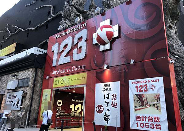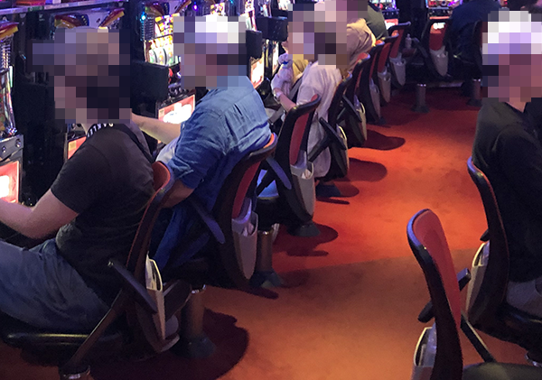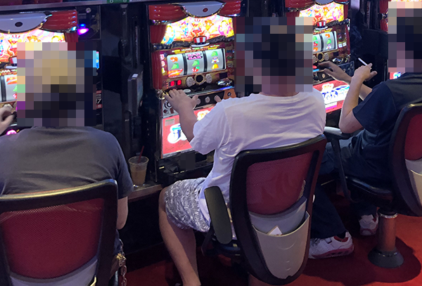ジャグラーシリーズを中心に、さまざまな機種に笑顔のプレイヤーの姿があった「123+N東雲店」。