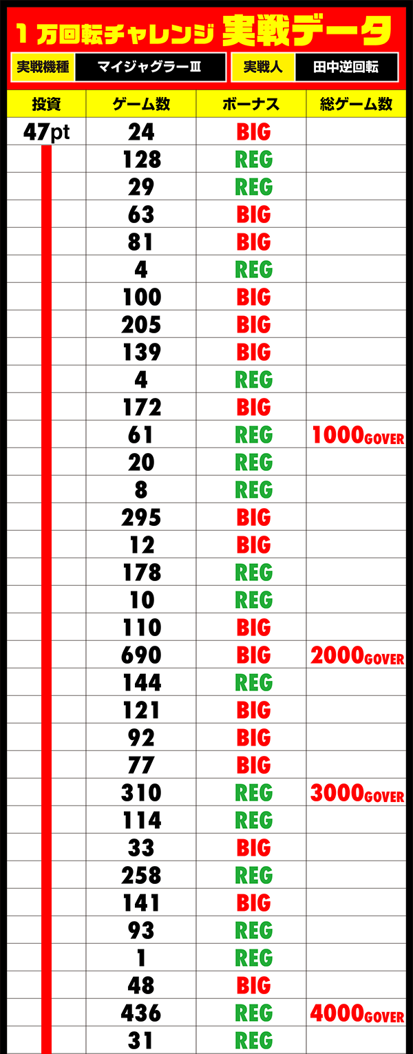 中盤以降の田中逆回転はというと、17時頃に5000Gを通過とかなりスローペース…。