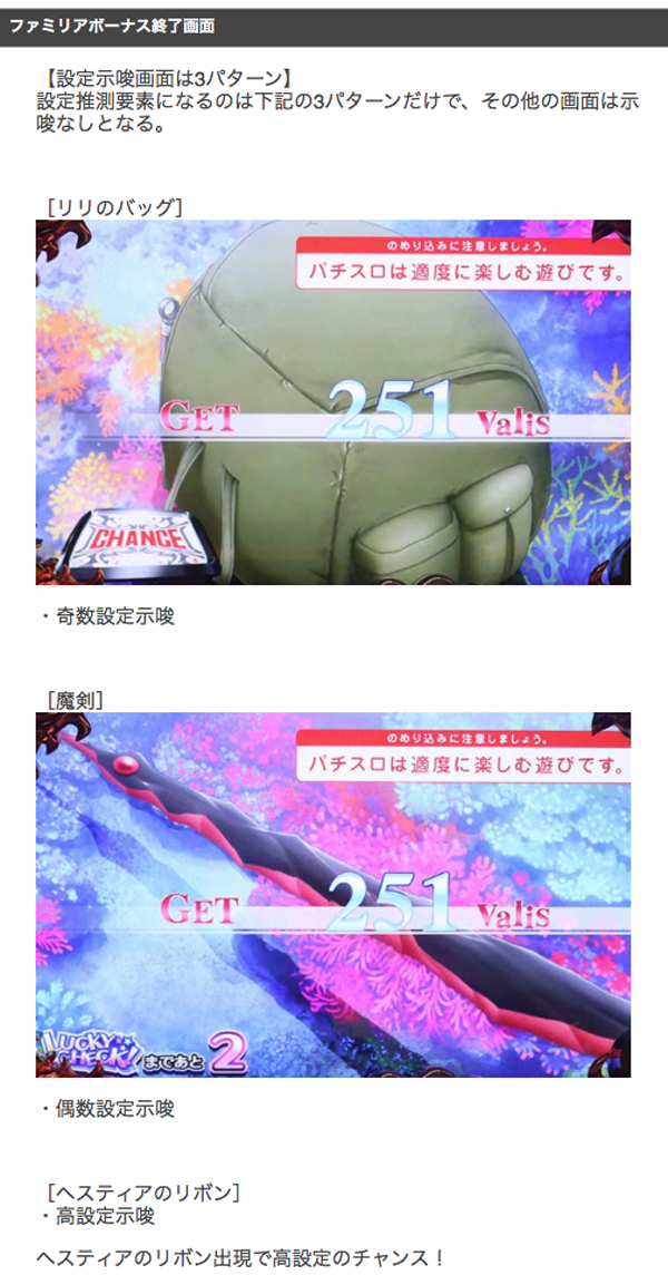 ファミリアボーナス終了画面のヘスティアのリボンは高設定ほど出やすい。