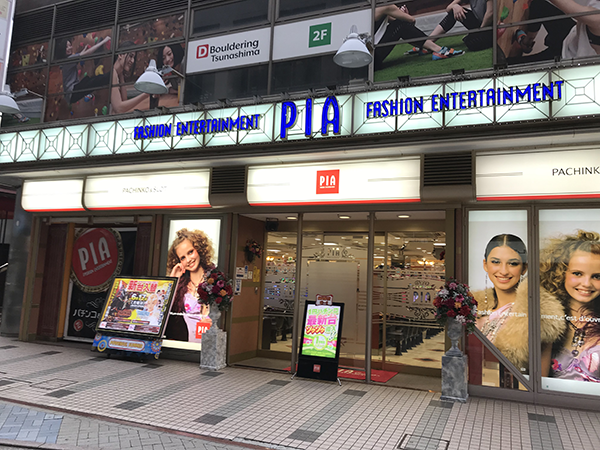 女性が写ったパネルや入場口に飾られた造花など、オシャレな外観も特徴のホールだ。