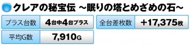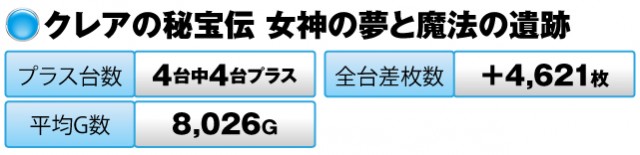 『クレアの秘宝伝〜眠りの塔とめざめの石〜』は4台すべてがプラスで全台差枚数が+17,375枚、『クレアの秘宝伝 女神の夢と魔法の遺跡』も4台すべてがプラスで全台差枚数は+4,621枚。