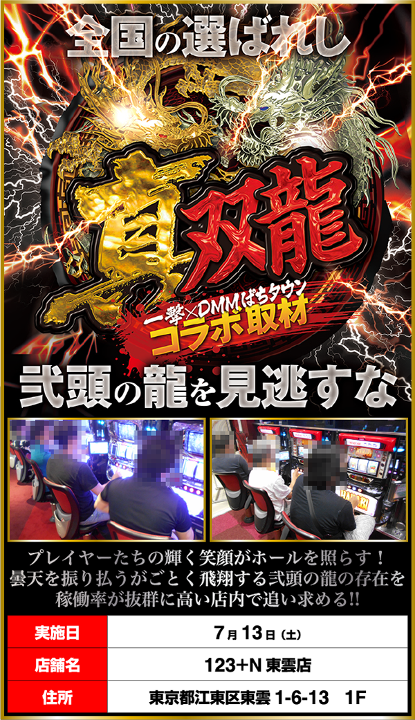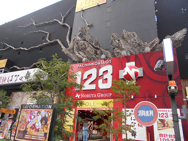 東雲駅で電車を降り、高層マンションなどが立ち並ぶ町並みを眺めながら歩いていくと、黒い外観のホールに到着。「真双龍」の舞台となった「123+N東雲店」だ。