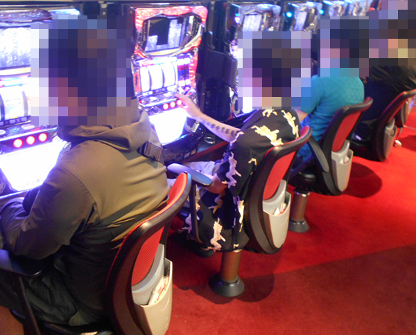 駐輪場にとめられた、たくさんの自転車やバイクなどを目にしながら入店したあとには、まず1階で多くの楽しそうなプレイヤーがみられた。パチスロのみが設置されている2階でも、イキイキとした表情を確認している。