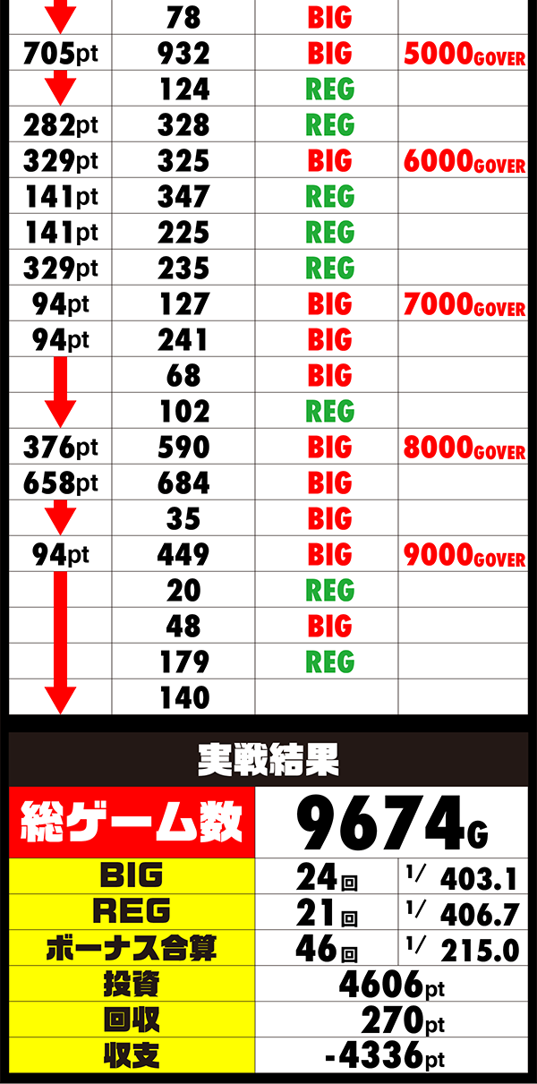 席に戻ってからも必死にレバーを叩いたが、9674Gを消化したところでタイムアップとなってしまった。