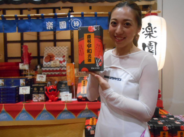 新元号がプリントされたパッケージのお菓子やオシャレなバッグなどが取り揃えられている賞品コーナーも注目をしたポイント。冷たいドリンクのほかに、常温のお茶や水のペットボトルがあるなど、体を冷やさないようにといった気配りも素晴らしかった。