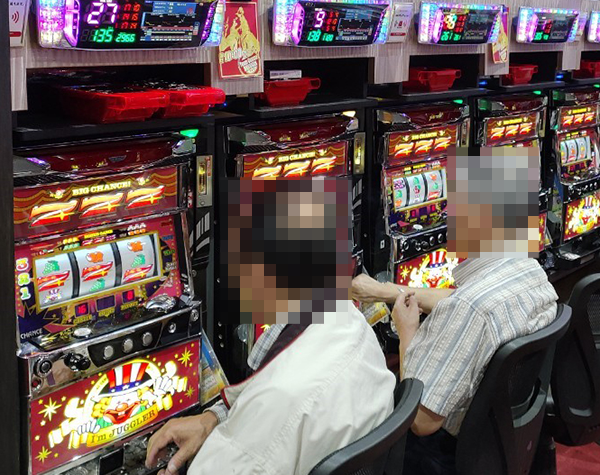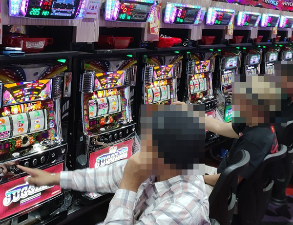 『アイムジャグラーEX-AE』の状況をうかがうと、たくさんのプレイヤーが遊技を楽しんでいた。