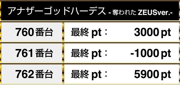 『アナザーゴッドハーデス-奪われたZEUSver.-』は3台がプラスpt。そのうちの1台は5000ptを上回っていた。