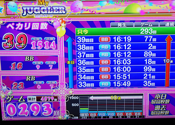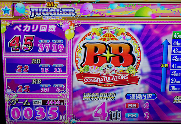 この日、もっとも多かったボーナス当選回数は『ゴーゴージャグラー』の73回!