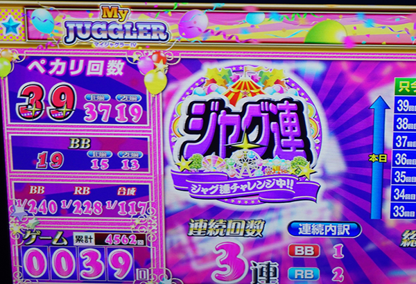 遊技を満喫しているような姿のほかに、4100Gを消化した時点でボーナスを37回獲得している台も確認済みだ。