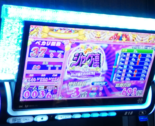 また、ボーナス当選回数が40回を目前とする台やボーナス合算確率が1/120を上回る台も目にした。