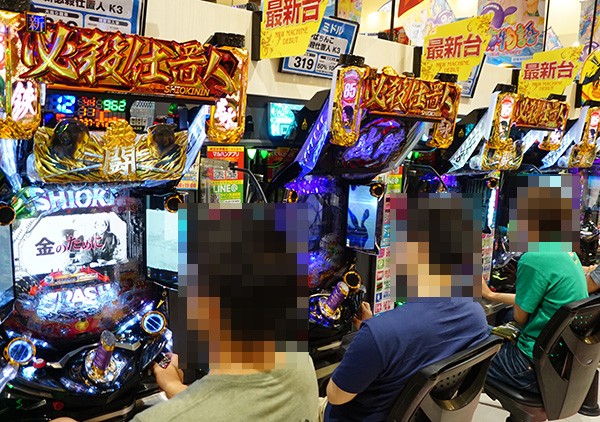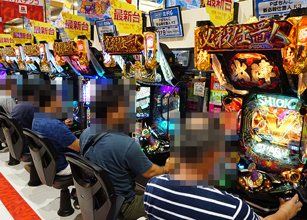 『ぱちんこ 新・必殺仕置人』をはじめ、さまざまな機種がフル稼働となっていた「マルハン前橋天川大島店」。