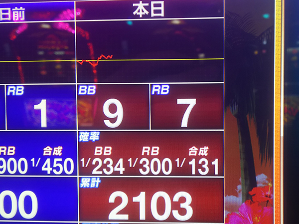 終盤もボーナスを消化する時間に苦戦し、思うようにゲーム数を伸ばせず…。ペースを上げられないまま、キビしい状況が続いていた。